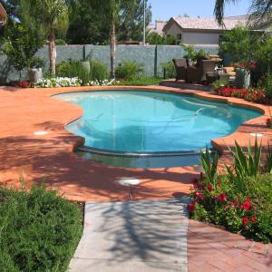 There are options for your fading pool deck including concrete stains and tintable, waterproof, slip resistent coatings like the deck shown below.